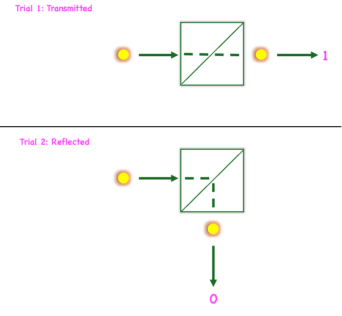 If the photon passes through → record a 1