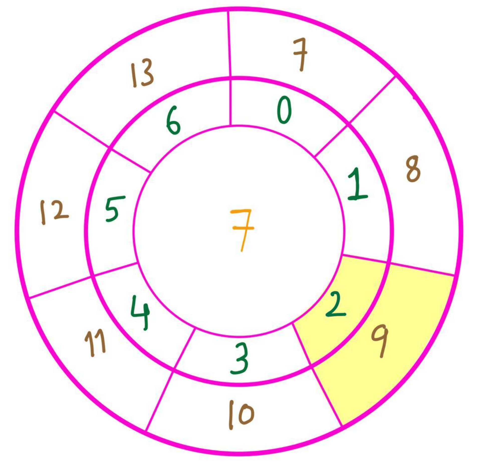 Step 2: Ask yourself: what are the possible remainders when a number is divided by 7? Those are precisely the numbers that go on the circle. For 7, the possible remainders are {0, 1, 2, 3, 4, 5, 6}.