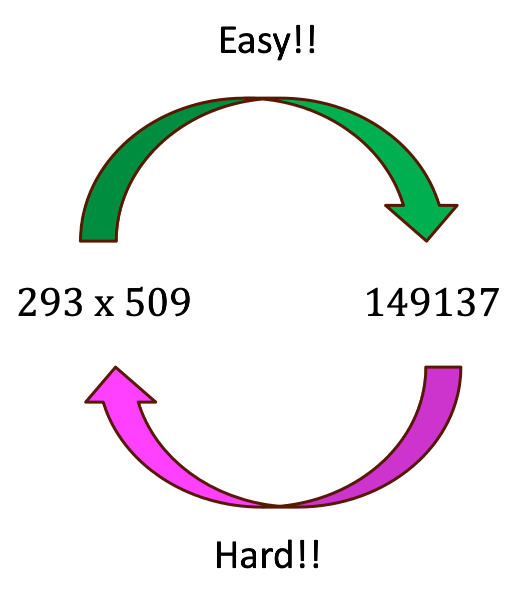 But now imagine I only give you the product — can you quickly find the two primes that created it? Everyone can say 14 is 7 times 2. Try 149137. Even powerful computers struggle with this when the numbers are very large. That’s our trapdoor!