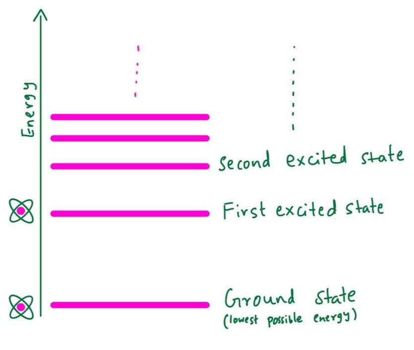 In classical physics, energy was thought to be continuous — it could take any value. Quantum mechanics, on the other hand, tells us that energy is not continuous but comes in tiny, discrete packets called quanta. That’s where the term quantum comes from. So, when we look at an atom and ask what energies its electrons can have, we find that they occupy specific, discrete energy levels — forming what is known as an energy spectrum. Having energy restricted to discrete levels is called the quantization of energy. The figure below illustrates the atom's energy levels.
