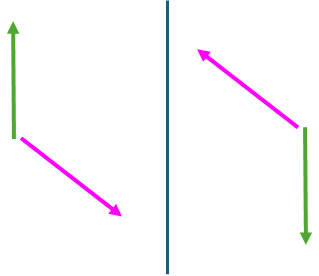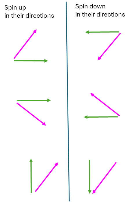 In the fourth case, the angle between their measurements is 135°. So their spin results will be opposite most of the times, so if Alice gets up, bob gets down or vice versa as shown below.